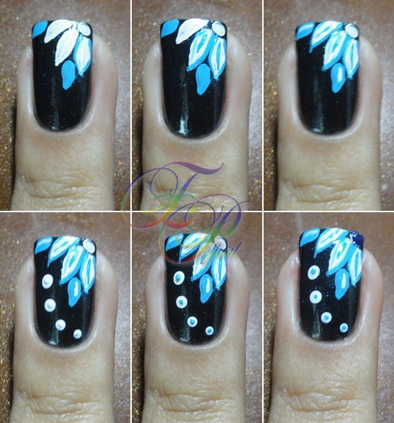 Com a bundinha do pincel, fiz bolinhas brancas e depois pontinhos azuis no centro de cada.